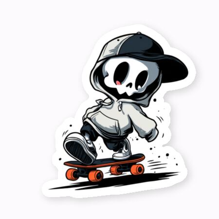 フーディーを着たドクロが、スケボーでゆるく滑るチルなデザイン。